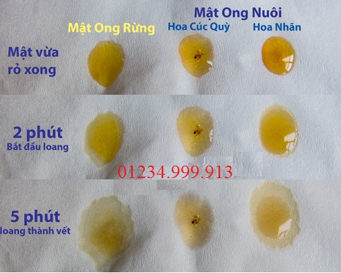 :) Phương pháp thử giấy đã không phân biệt được đâu là mật ong rừng, đâu là mật ong nuôi rồi. Ta chuyển sang phương pháp thứ 2 là Rỏ 1 giọt mật vào cốc nước. Có người bảo mật ong rừng thì tròn vo, không tan. Còn mật ong nuôi hoặc không nguyên chất thì thả vào tan ngay trong nước! Không tạo thành giọt.
